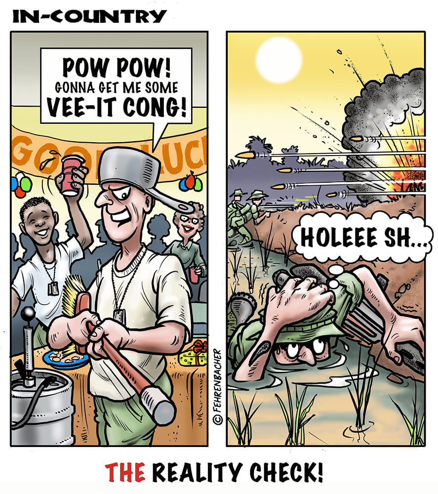 Phil enlisted in the Army in 1965 where he served for years in Vietnam.  He became a graphic designer and has worked for the state of Oregon for 26 years.  He retired in 2003 and started the Cartoon "In-Country".  The cartoons reflect his experiences during his tour of duty in South Vietnam.