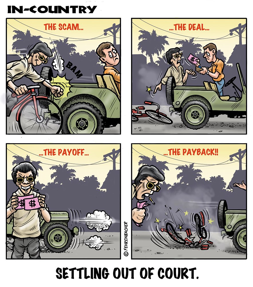Phil enlisted in the Army in 1965 where he served for years in Vietnam. He became a graphic designer and has worked for the state of Oregon for 26 years. He retired in 2003 and started the Cartoon "In-Country". The cartoons reflect his experiences during his tour of duty in South Vietnam.